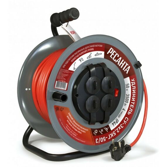 Удлинитель силовой на металлической катушке РЕСАНТА СУ-3х2.5-50/3 50 м, КГт, 3х2.5, 4 гнезда, металлическая катушка, выключатель с тепловым реле [61/118/10]