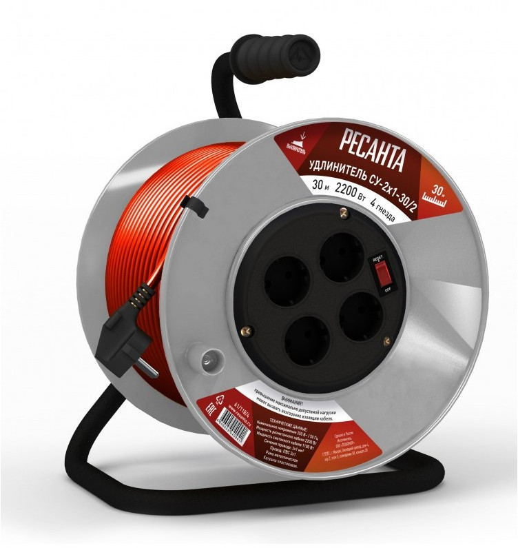 Удлинитель силовой на катушке РЕСАНТА СУ-2х1-30/2 30 м, ПВС, 2х1, 4 гнезда, пластиковая катушка, выключатель с тепловым реле [61/118/4]