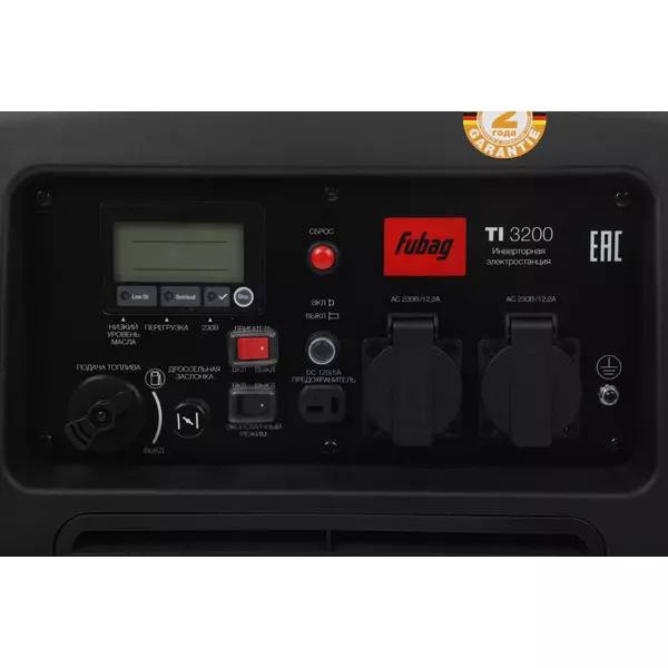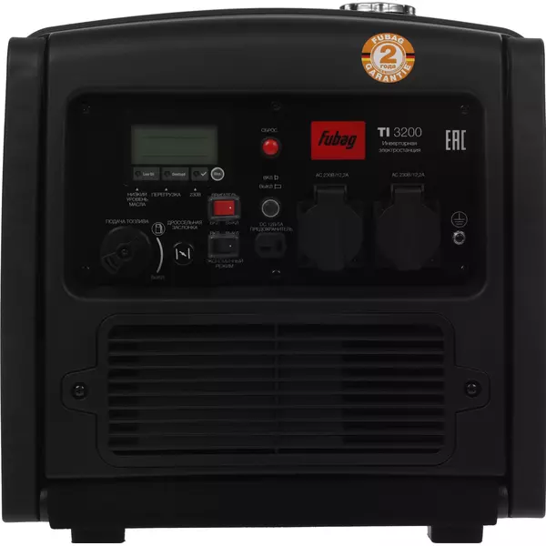 Особенности | Профессиональный OHV-двигатель FUBAG. Вместительный бак 7,8 л для работы до 4,5 часов без дозаправки (75% нагрузки). 1 розетка 12 В и 2 розетки 230В/16А. Режим экономии топлива. Шумозащитный кожух. Мультифункциональный цифровой дисплей. |