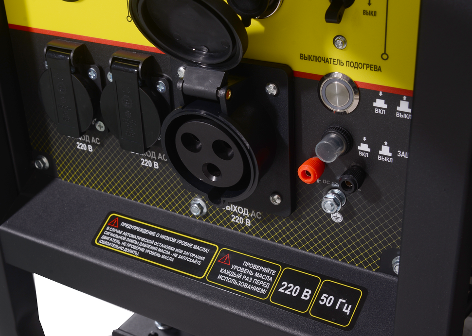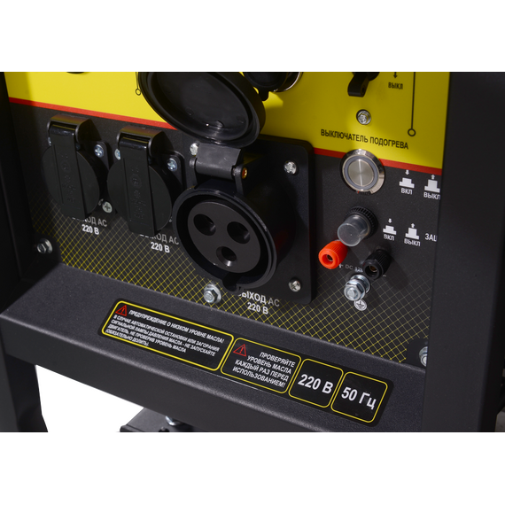 | Комплектация | Паспорт изделия, Аккумулятор, Колеса, Ключ электростартера, Масляная воронка, Силовые вилки 16А и 32А, Гаечные ключи |