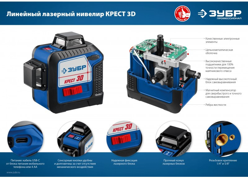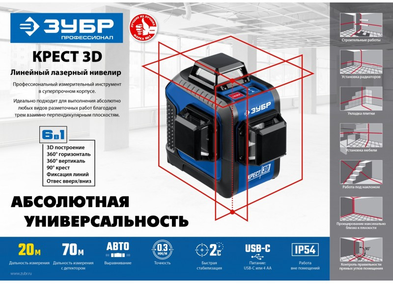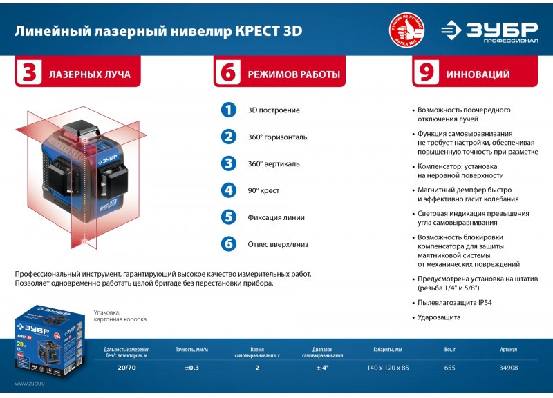 Лазерный нивелир Зубр КРЕСТ 3D 20-70 м [34908]