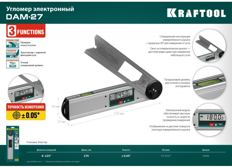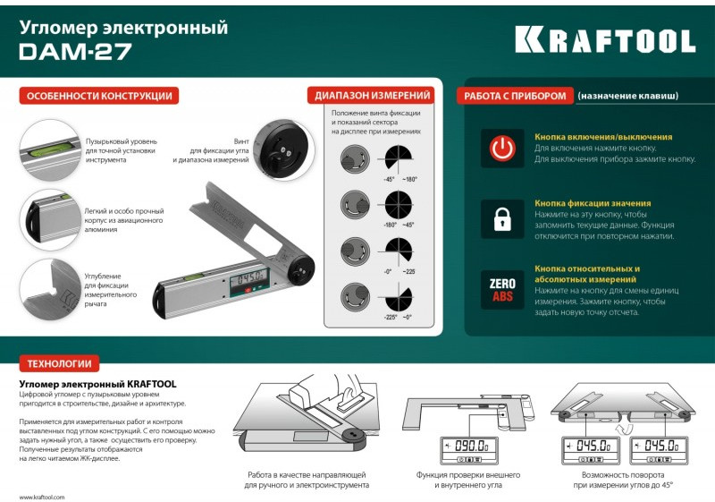 Угломер электронный KRAFTOOL DAM-27 250 мм, диапазон 0-225°, точность ±0.05° [34684]