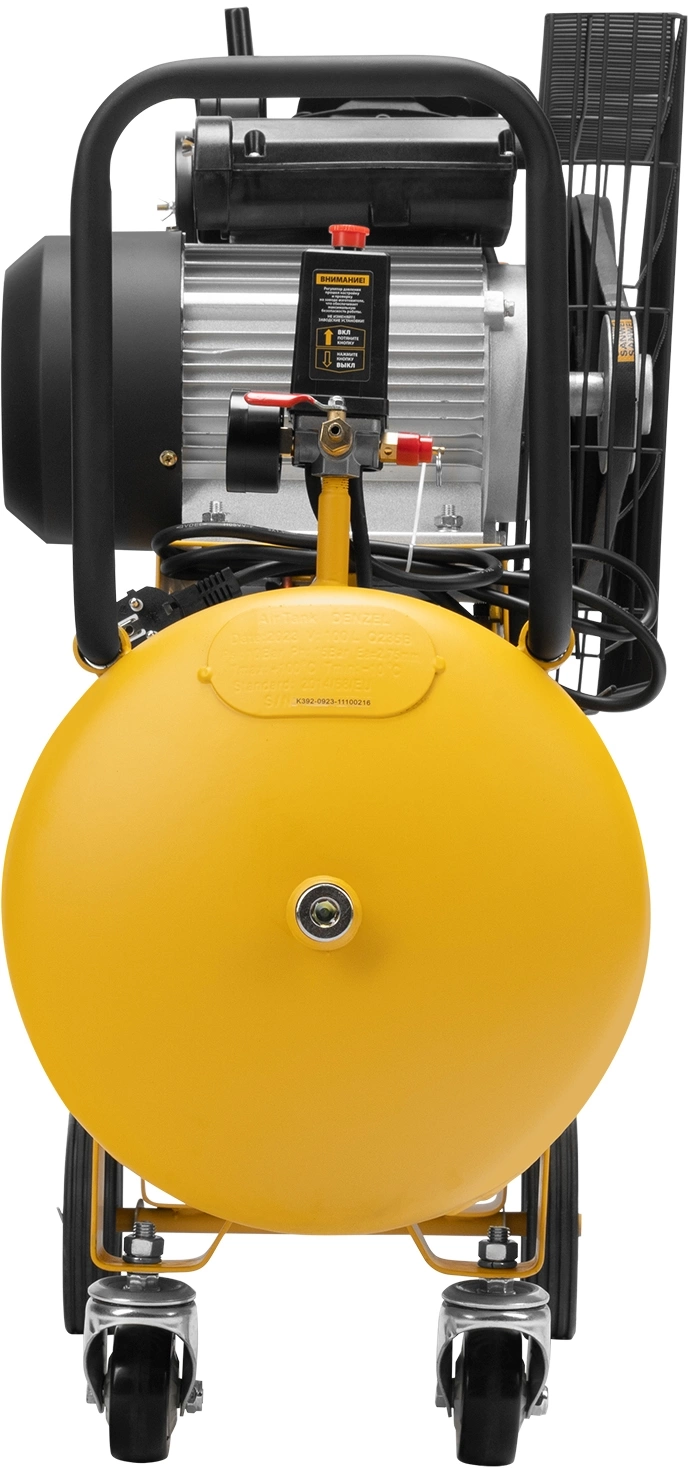 | Особенности | Ременная передача, колеса для перемещения, чугунные цилиндры с увеличенными рёбрами, регулятор выходного давления, фильтр-влагоотделитель на выходе, штуцер для подключения дополнительного ресивера или пневмолинии. |