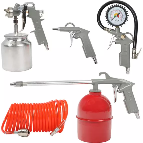 | Комплектация | Компрессор, воздушный фильтр, набор пневмоинструмента (шланг, продувочный пистолет, пистолет для накачки шин), комплект колес и амортизатор. |