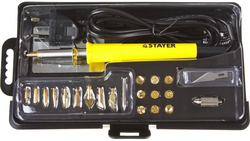 Прибор для выжигания, пайки и резки STAYER 45227 3 в 1 30Вт, в наборе 20 насадок, в кейсе [45227]