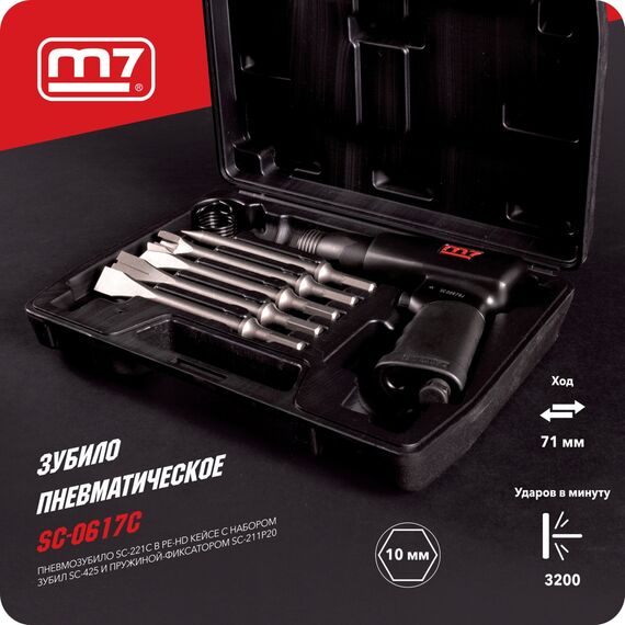 Пневмозубило MIGHTY SEVEN SC-0617C 10 мм, 3200 уд/мин, с набором насадок, 7 предметов