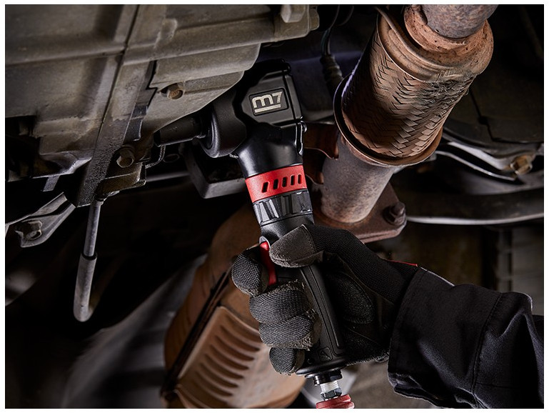- Особенности: Гайковерт оснащен специальным редуктором углового типа, благодаря которому инструмент имеет угловой тип корпуса и малый размер по оси. Возможность регулировки направления выпуска воздуха.