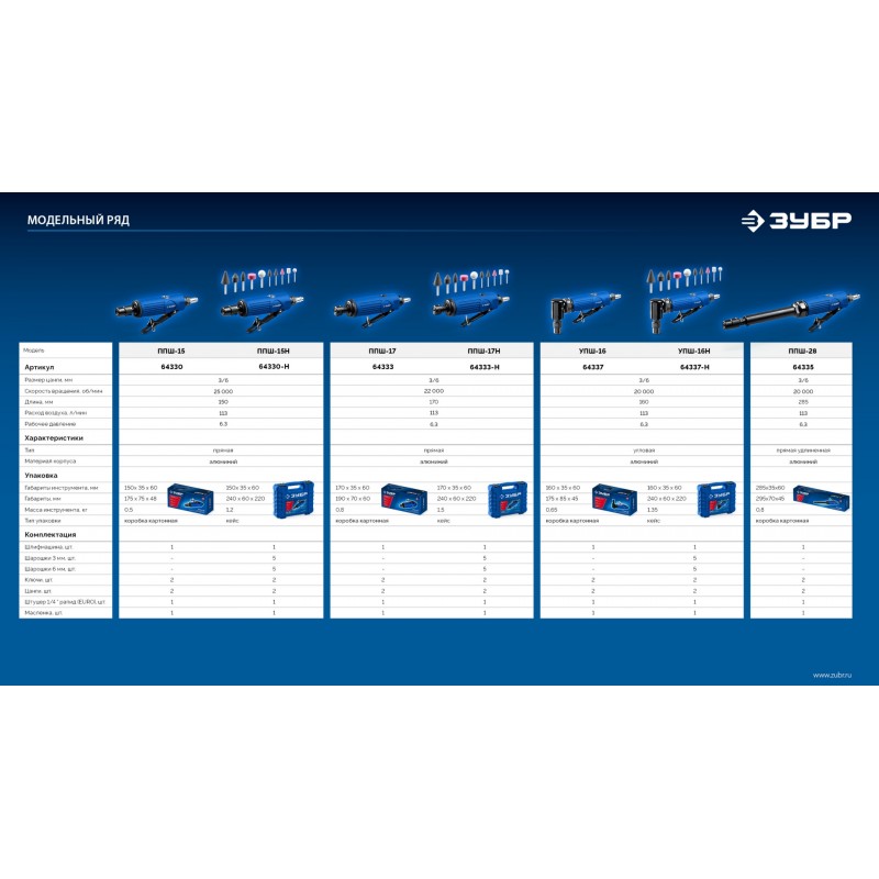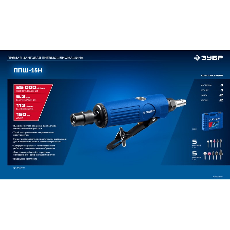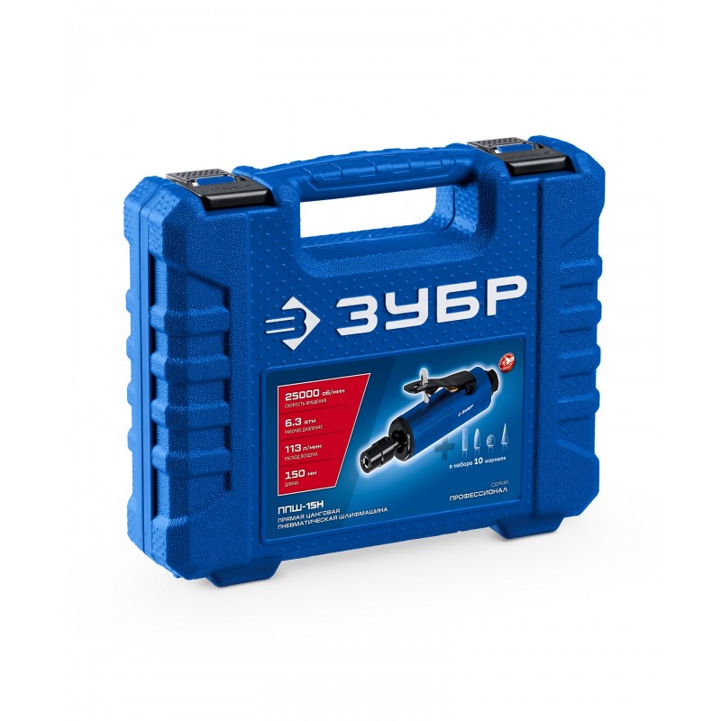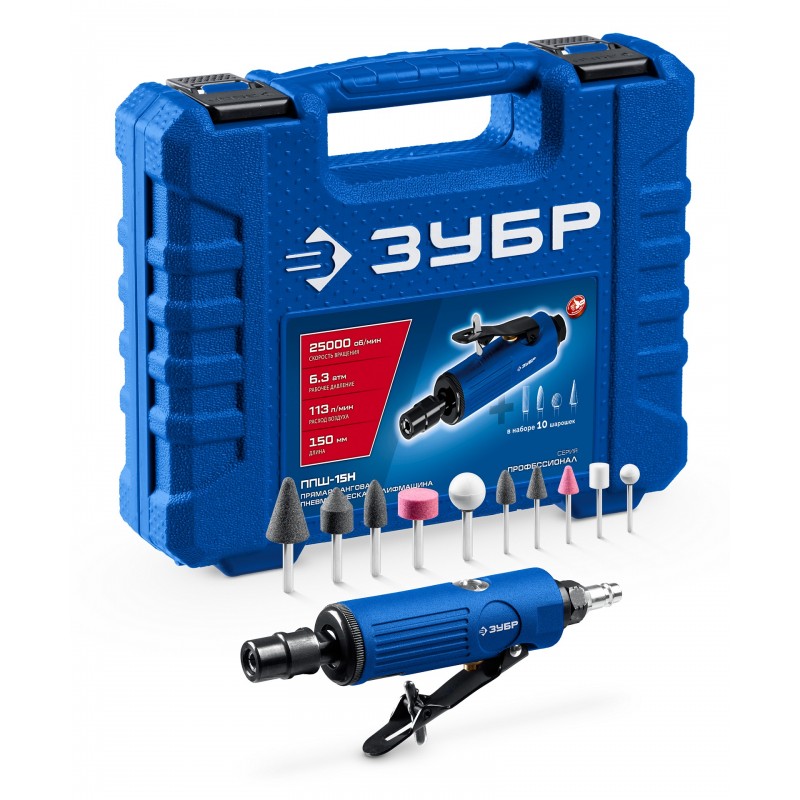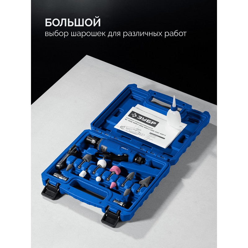 Прямая цанговая пневмошлифмашина Зубр 64330-H набор в кейсе: 10 шарошек и оснастка, ПРОФЕССИОНАЛ