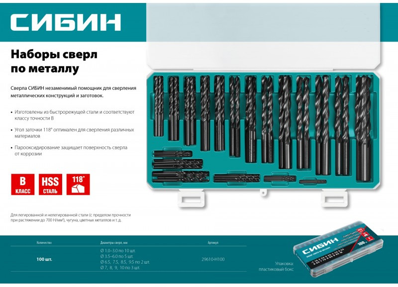 Набор сверл по металлу СИБИН 100шт(1-10мм) быстрорежущая сталь, класс В, пласт.бокс [29610-H100]