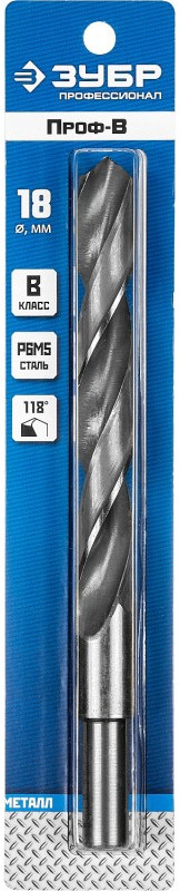 Сверло по металлу Зубр ПРОФ-В 18.0х191мм проточенный хвостовик, сталь Р6М5, класс В [29621-18]