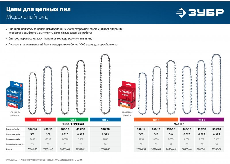 Пильные цепи ЗУБР изготовлены для использования в самых ответственных работах и в самых трудных условиях. Высокое качество материалов и изготовления гарантирует надежность и отличные характеристики на весь срок службы