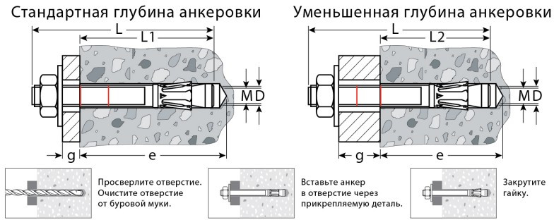 - Максимальная толщина скрепляемых материалов при уменьшенной глубине анкеровки, мм: 53