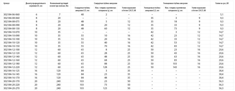 - Усилие вырывания в бетоне С20/25 (уменьшенная глубина анкеровки), kN: 12
