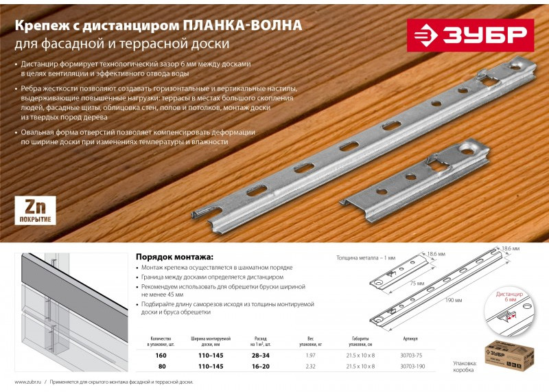 Крепеж с дистанциром для фасадной и террасной доски Зубр Планка-Волна 190 мм 80 шт, оцинкованный [30703-190]