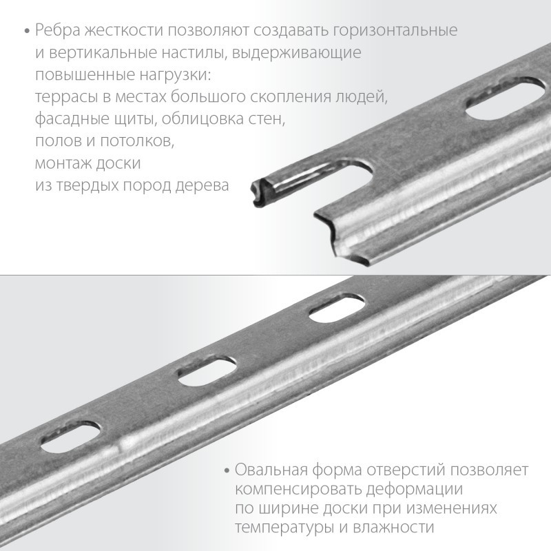 - Прямоугольная форма отверстий позволяет компенсировать деформации по ширине доски при изменениях температуры и влажности