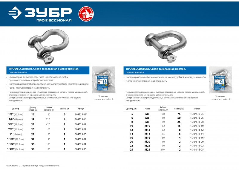 Скоба такелажная омегообразная Зубр 7/8" (22.2 мм) 2 шт, палец 25 мм, г/п 6.5 тн, оцинкованная [304525-22]