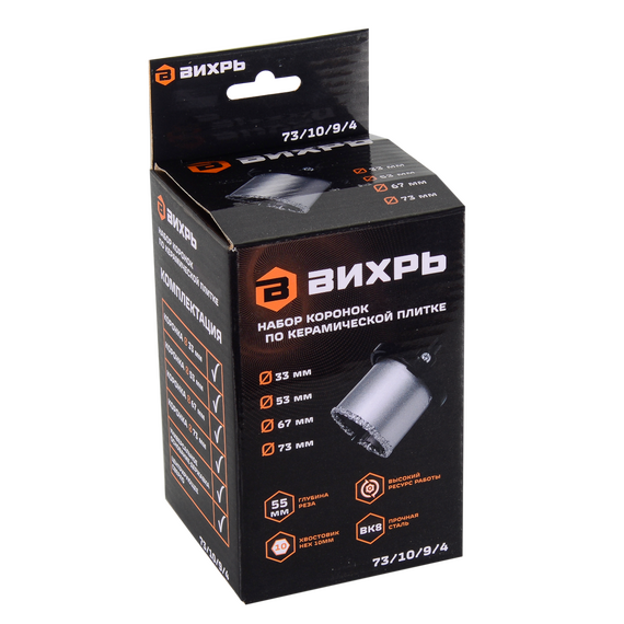 Набор коронок по керамической плитке Вихрь 33-53-67-73 мм