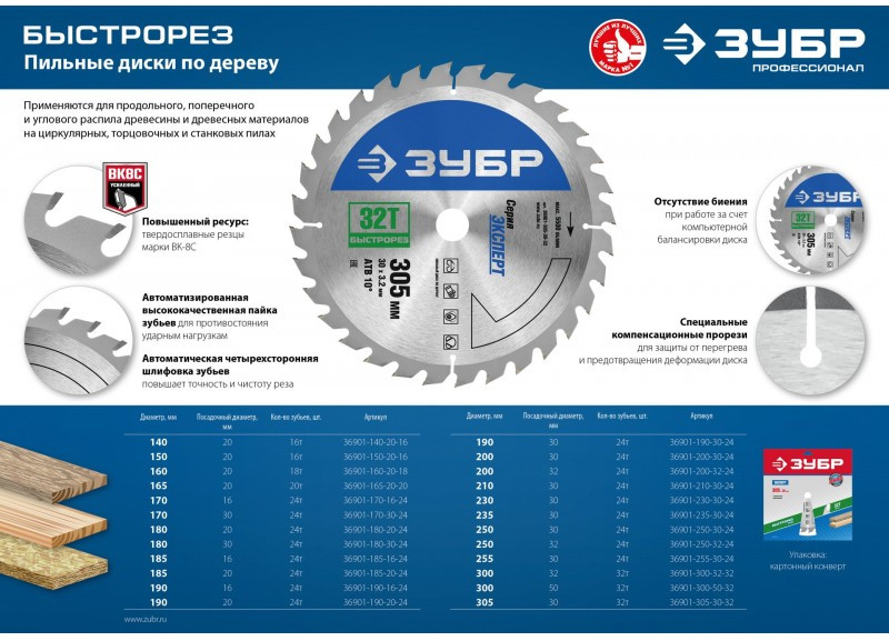Быстрорез - пильный диск, идеально подходящий для быстрого продольного и поперечного распила любых типов древесины. Используется для распила древесины мягких и твердых пород, ДСП, МДФ и фанеры.