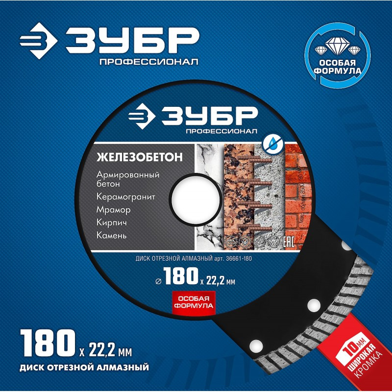 Алмазный диск Зубр Профессионал Железобетон 180 мм 22.2 мм, 10х2.6 мм [36661-180]