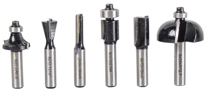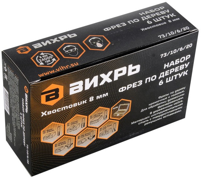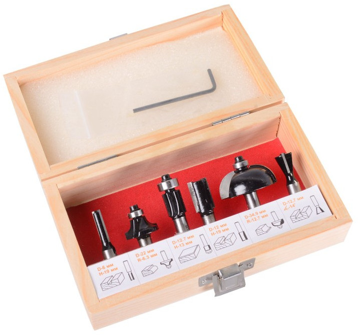 - Набор фрез по дереву Вихрь 6шт с хвостовиком 8мм в кейсе для работы с фрезерными станками и ручными фрезерами.