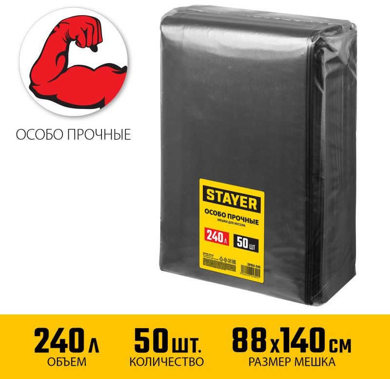 Строительные мусорные мешки STAYER HEAVY DUTY 240 л 50 шт, черные, особопрочные [39154-240]
