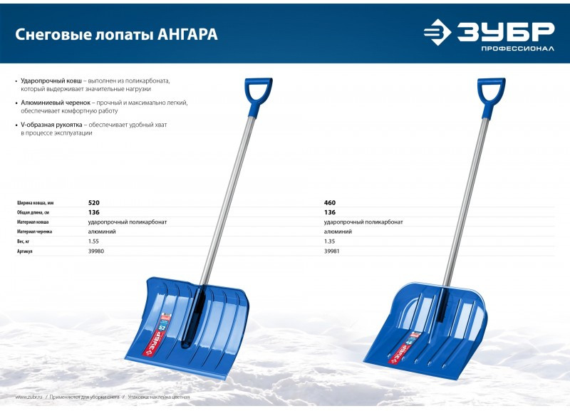 Снеговая лопата Зубр Профессионал АНГАРА ковш 46 см морозостойкий поликарбонат, ударопрочная, легкий черенок из алюминия, V-ручка [39981]