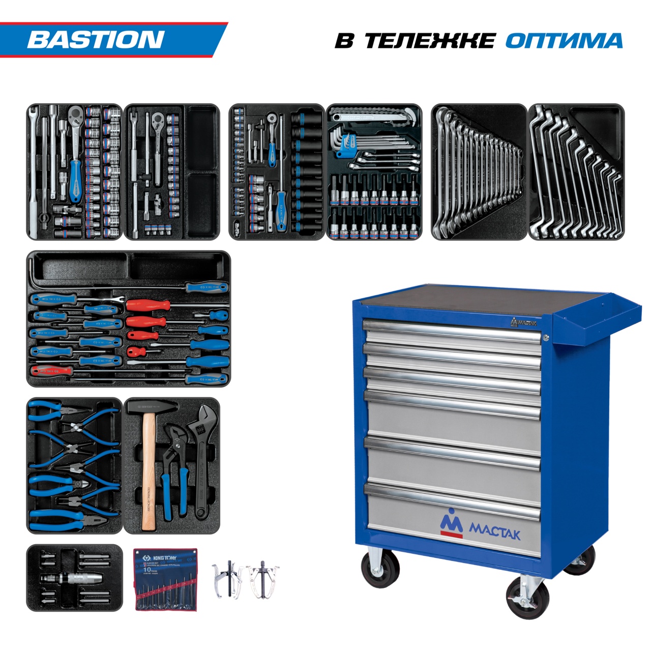 Набор инструментов King Tony 934-100AMB 204 предмета, "BASTION", в синей тележке