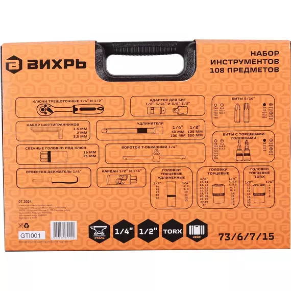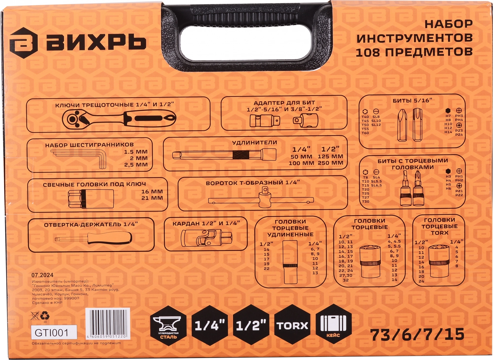 | Дополнительно в наборе, 1 / 2"DR | Удлинители 125, 250 мм.адаптер H5/16, адаптер для бит 5/16", вороток Т-образный, карданный шарнир, трещотка |