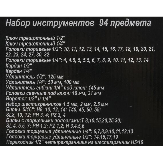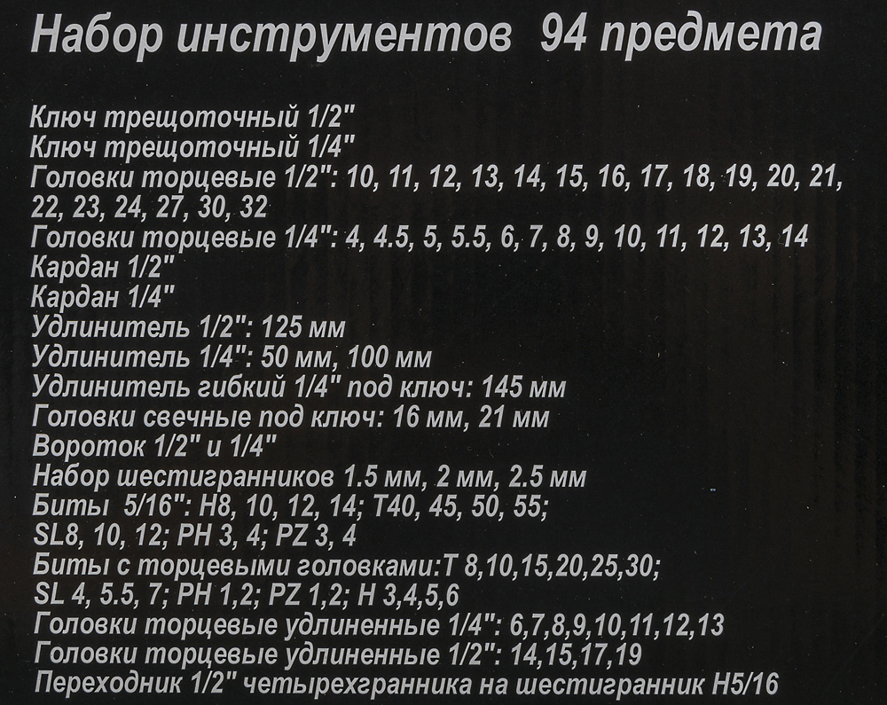 | Головки 1 / 4"DR, список | Головки торцевые 4, 4.5, 5, 5.5, 6, 7, 8, 9, 10, 11, 12, 13, 14 ммГоловки торцевые глубокие 6, 7, 8, 9, 10, 11, 12, 13 ммГоловки торцевые с битами H3, H4, H5, H6, PH1, PH2, PZ1, PZ2, SL4, SL5.5, SL7, T8, T10, T15, T20, T25, T30 |