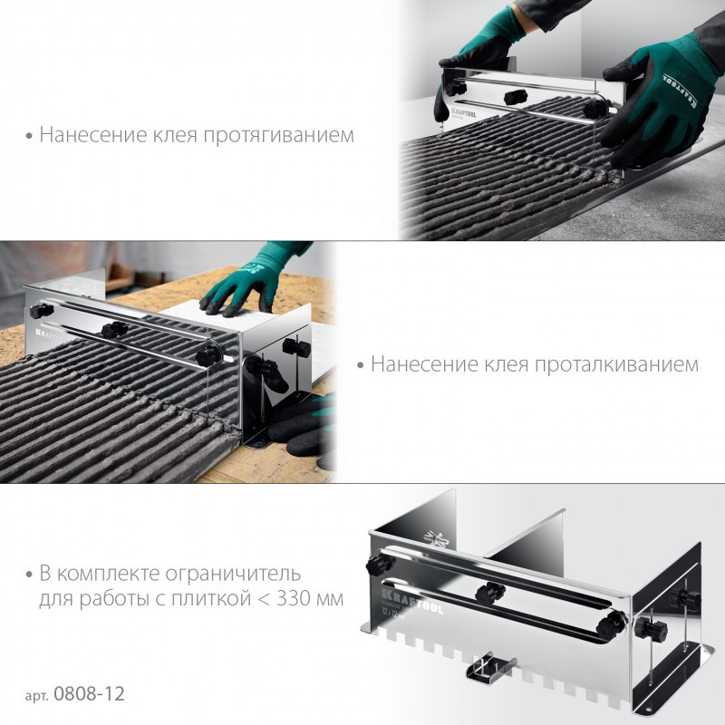Предназначена для быстрой работы с большим объемом работ по укладке плитки шириной до 600мм. Сделана из стали AISI 430, благодаря которой гребенка обладает повышенными эксплуатационными характеристиками. Имеет величину зуба 12мм. Боковые регуляторы помогут закрепить гребенку на рабочей поверхности и настроить её по высоте под любую плитку. В комплекте имеется дополнительная секция, благодаря которой гребенку можно использовать даже с самыми узкими плитками. Легко моется, не боится влаги.