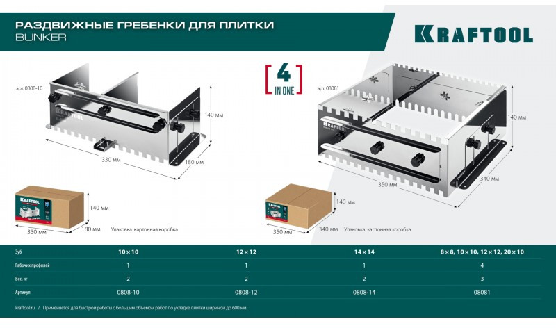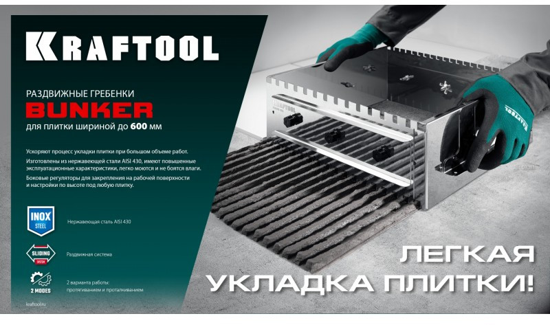 Раздвижная гребенка для плитки KRAFTOOL BUNKER зуб 14*14 мм до 600 мм, нерж. сталь [0808-14]