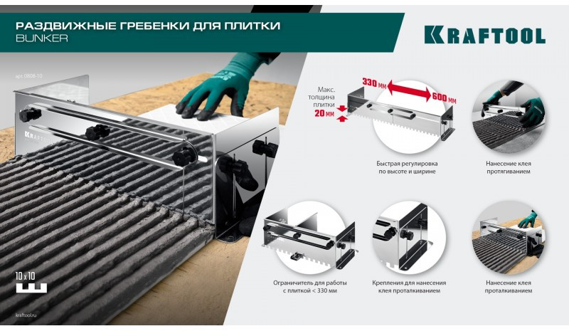 Имеет величину зуба 14мм. Боковые регуляторы помогут закрепить гребенку на рабочей поверхности и настроить её по высоте под любую плитку. В комплекте имеется дополнительная секция, благодаря которой гребенку можно использовать даже с самыми узкими плитками. Легко моется, не боится влаги.