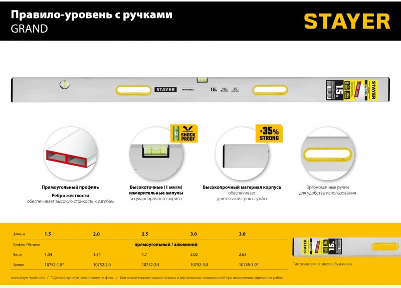 Правило-уровень с ручками STAYER GRAND 2.5 м [10752-2.5]