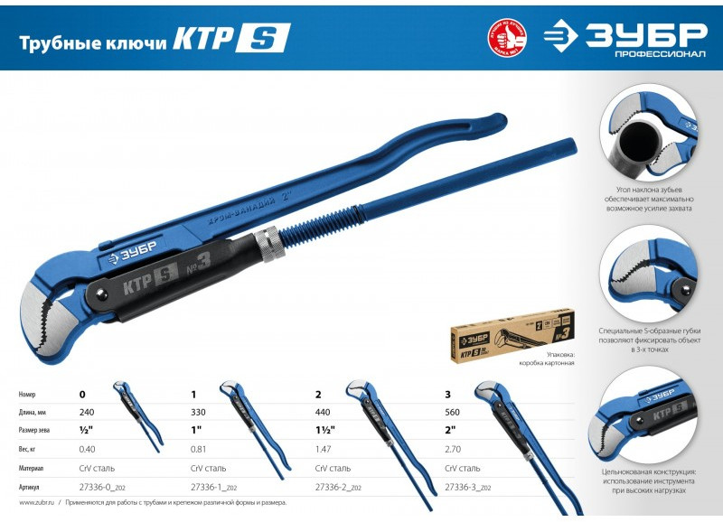 Трубный ключ с изогнутыми губками Зубр Профессионал №2, 1.5" 440 мм, ТИП "У" [27336-2]