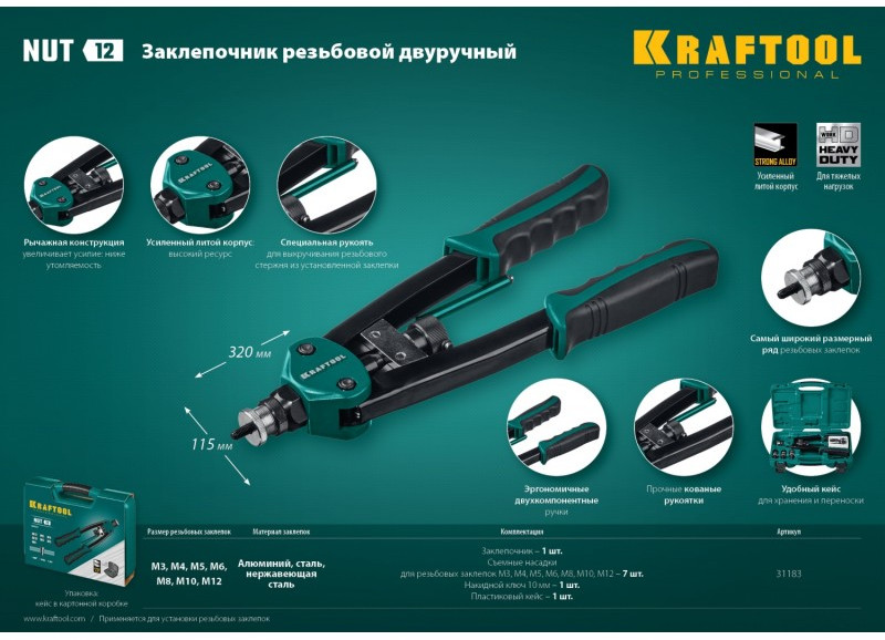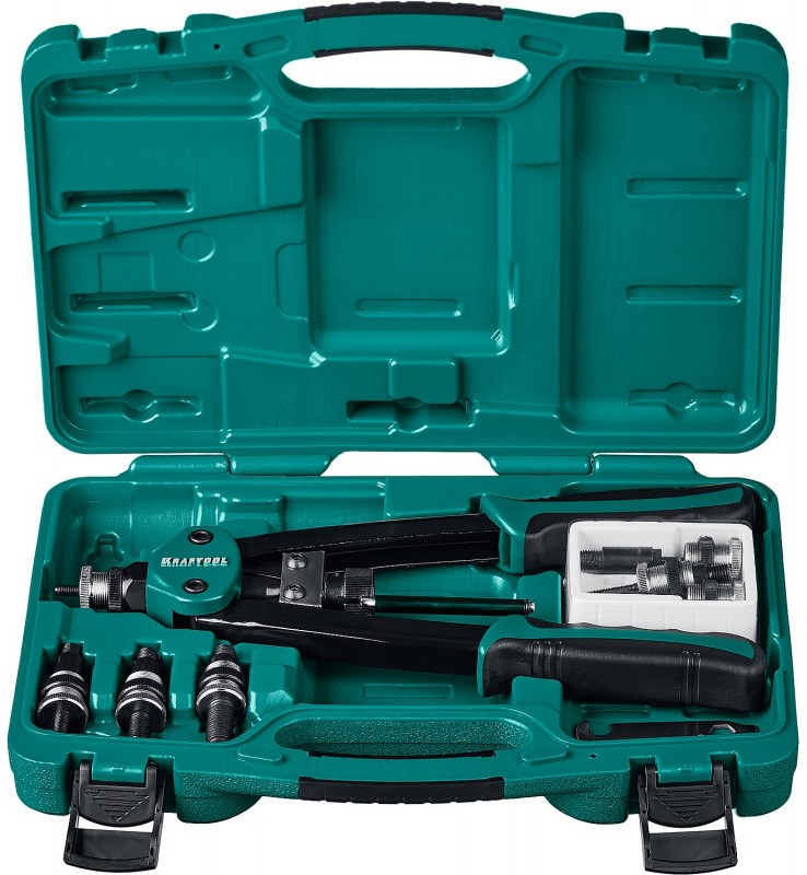 - Двуручный резьбовой заклепочник KRAFTOOL выдерживает высокие рабочие нагрузки и предназначен для установки резьбовых заклепок из алюминия, стали и нержавеющей стали.