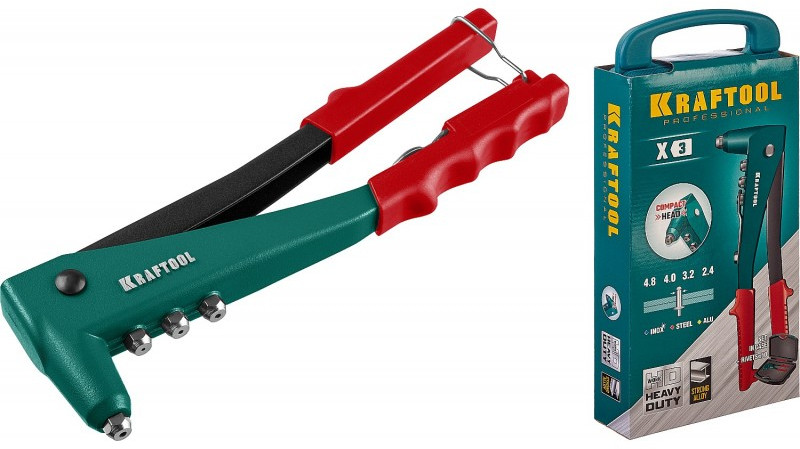 Заклепочник KRAFTOOL выдерживает высокие рабочие нагрузки и предназначен для установки заклепок из алюминия, стали и нержавеющей стали различных диаметров согласно таблице.