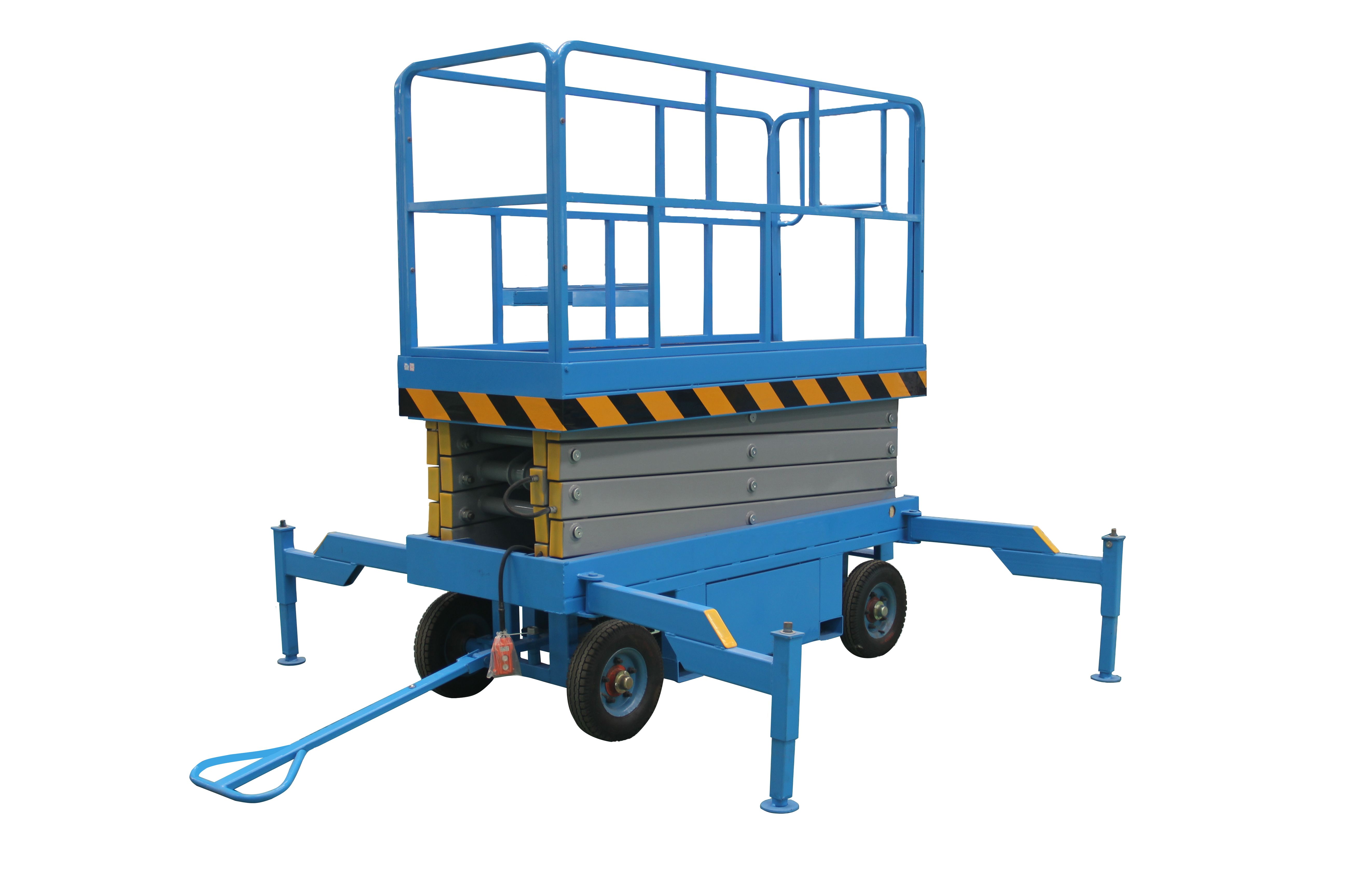 Передвижной ножничный подъемник TOR SJY DC. Модель оснащена аккумулятором, подъем площадки осуществляется за счет работы электромотора, передвижение за счет внешнего усилия.