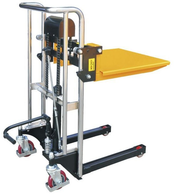 Также помимо классических вил у штабелера имеется съемная площадка и его можно использовать как подъемную площадку. Конкретно эта модификация поднимает груз весом в 400 кг на высоту 1,5 метра. В силу свое простоты он стоит примерно на 30% дешевле любого ручного штабелера и может быть самым выгодным вариантом при не высокой интенсивности работ и обработке не тяжелых паллетированных и непаллетированных грузов.