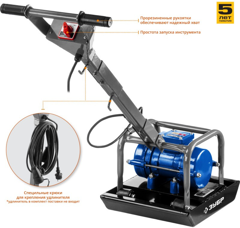 - Электрическая виброплита ЗУБР проста в использовании и не требует от оператора приобретения специальных навыков для управления. Машина работает от электрической сети напряжением 220 В, поэтому не производит вредных выхлопов.