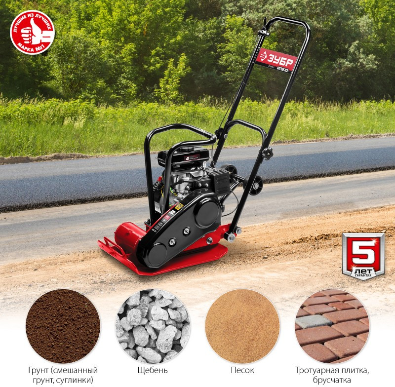 - Виброплита предназначена для уплотнения бетонных, асфальтовых и сыпучих материалов, а также для формирования уплотненных поверхностей. Компактная конструкция позволяет осуществлять уплотнение смешанного грунта в самых узких местах, даже в очень узких траншеях. Направляющая рукоятка с виброзащитой позволяет увеличить количество часов непрерывной работы и снизить усталость для оператора. Четырехтактный двигатель ″ЗУБР″ обеспечит беспроблемную эксплуатацию при минимальном сервисном обслуживании на весь срок использования.