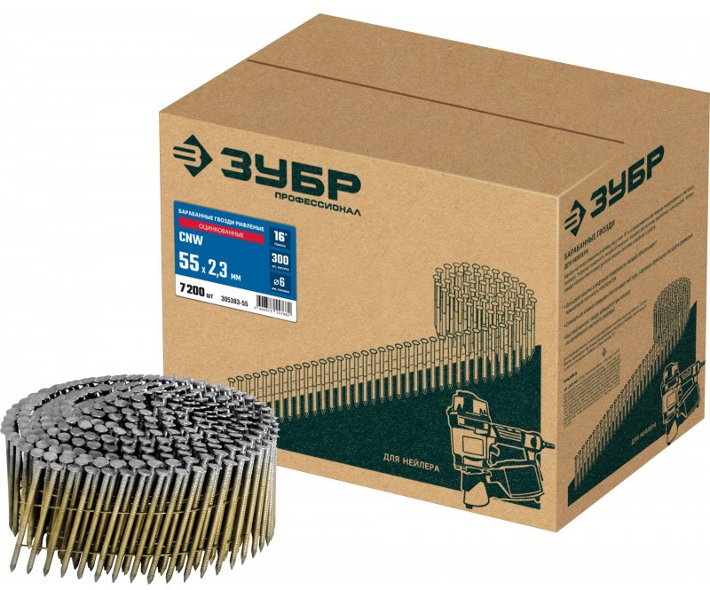 Барабанные гвозди рифленые оцинкованные Зубр CNW 55 х 2.3 мм 7200 шт [305383-55]