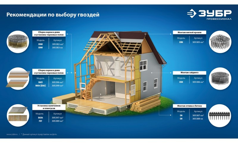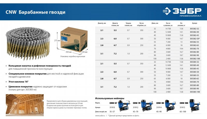 Для сборки деревянных конструкций, крепления тонколистового металла до 0.9 мм. В каркасном домостроении используются для сборки каркаса дома и установки черновых полов. Монтаж производится при помощи гвоздезабивного пистолета (нейлера) ЗУБР CNW-57 (арт. 31910), ЗУБР CNW-70 (арт. 31912), ЗУБР CNW-90 (арт. 31914) или аналогичного, рассчитанного на работу с барабанными гвоздями с углом наклона 16 град.