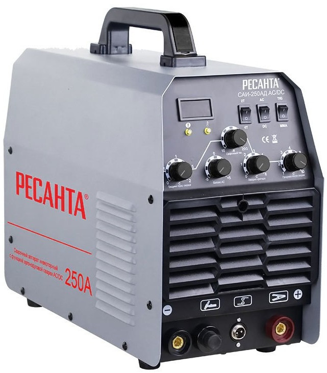 - Сварочный аппарат РЕСАНТА САИ-250АД AC/DC - современная инверторная аргонодуговая установка, позволяющая работать как на постоянном (сварка черных и нержавеющих сталей, меди, титана и пр.), так и на переменном токе (сплавы алюминия, магния, медные сплавы больших толщин и пр.), где требуется удаление окислов со свариваемой поверхности в режиме TIG, а также возможна сварка ММА покрытым электродом (рутиловым и основным покрытием)