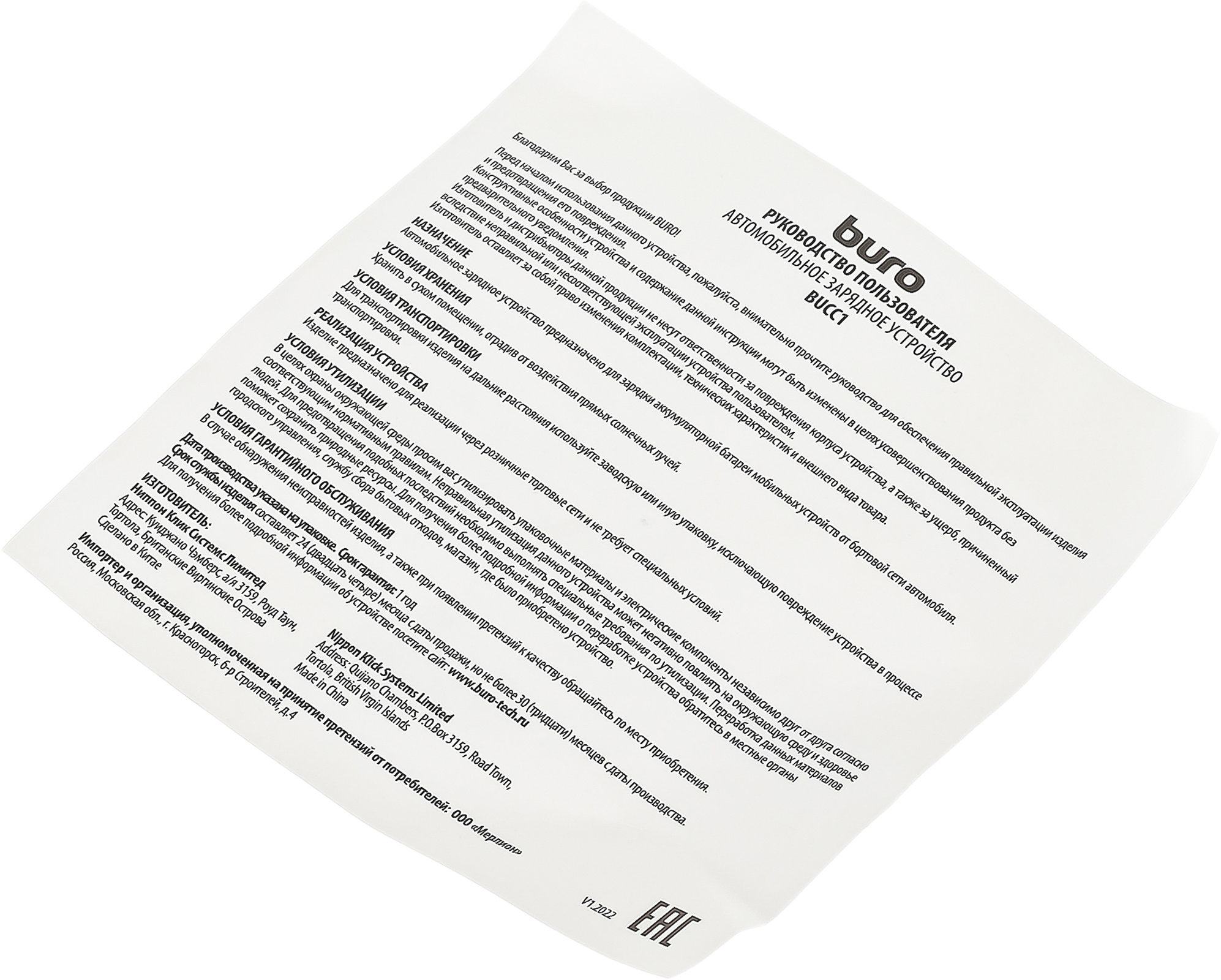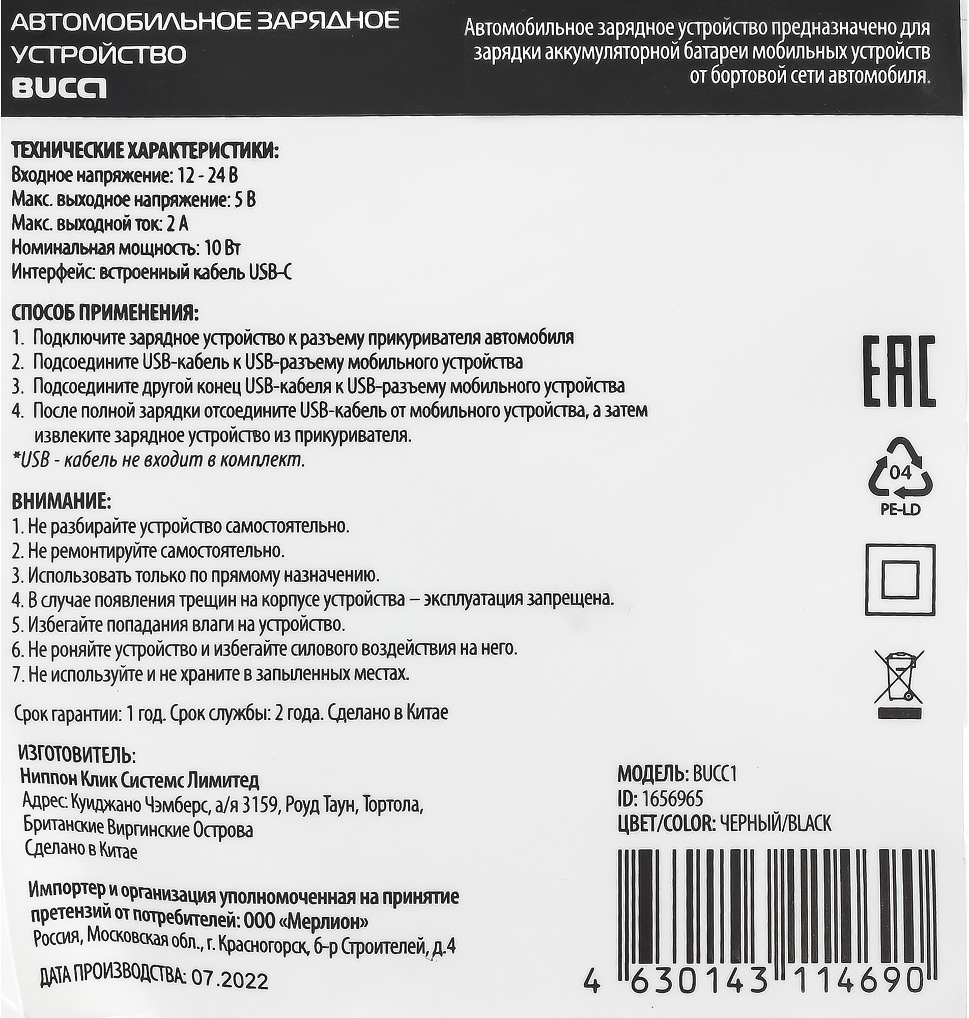 Автомобильное зарядное устройство BURO BUCC1 10W 2A универсальное черный [BUCC10S00CBK]
