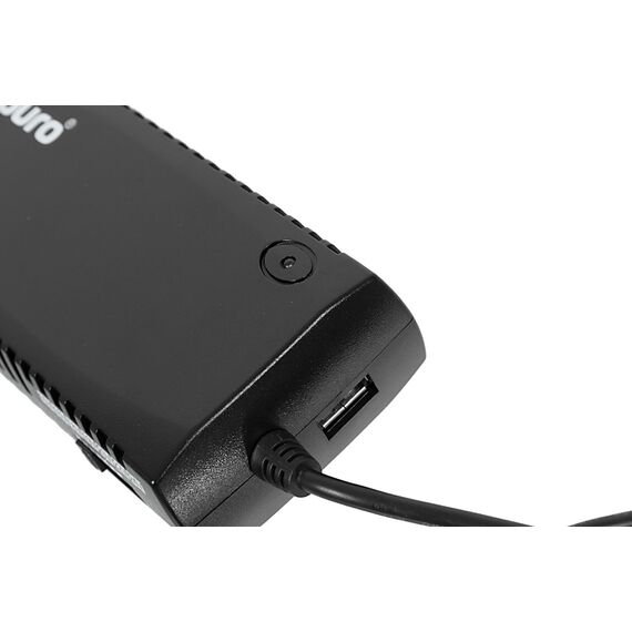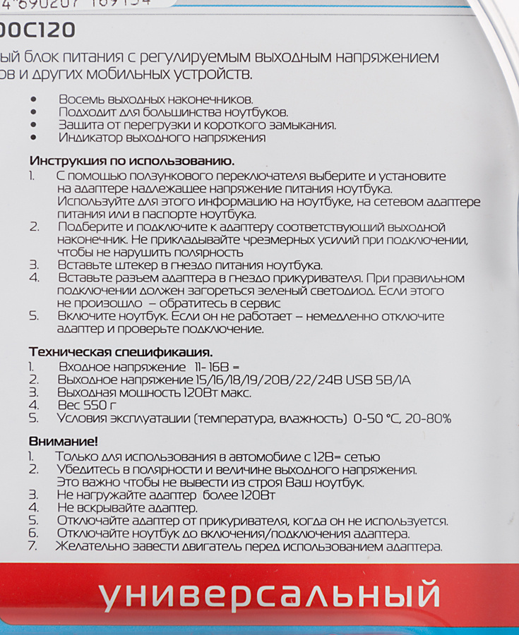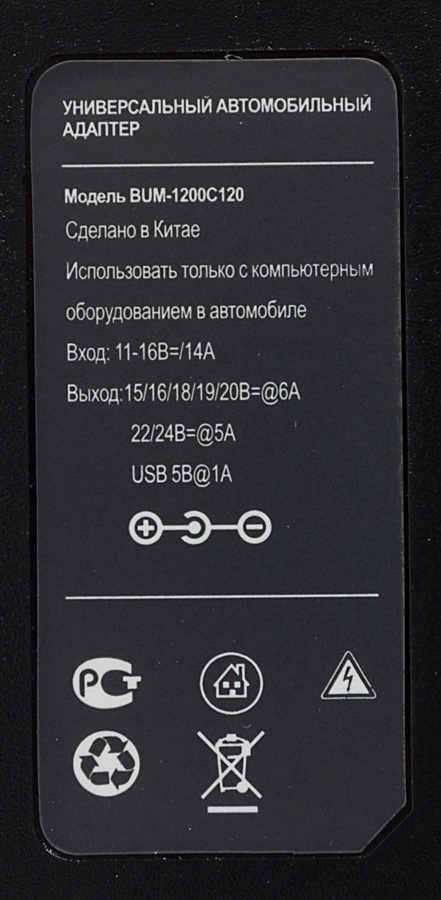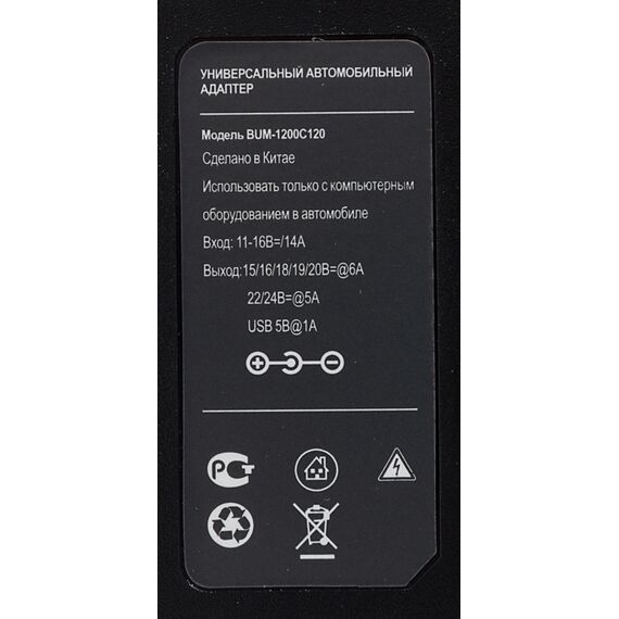Универсальный автомобильный адаптер для ноутбуков мощностью 120 ватт и USB-портом для зарядки мобильных телефонов и планшетов. В комплекте входят 11 сменных штекеров, подходящих к большинству ноутбуков. Выбор мощности для питания происходит в ручном режиме.