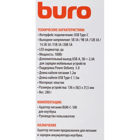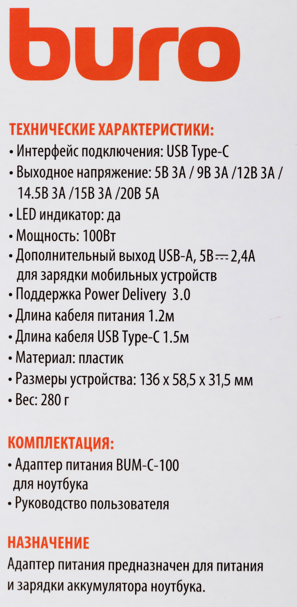 Блок питания BURO BUM-С-100 автоматический 100W 5V-20V 5A 1xUSB 2.4A LED индикатор