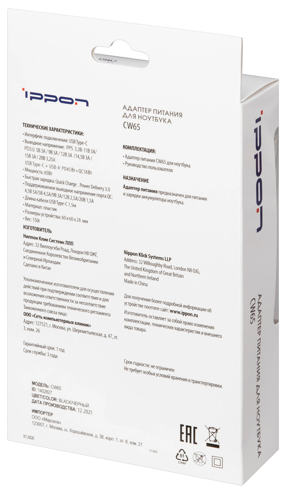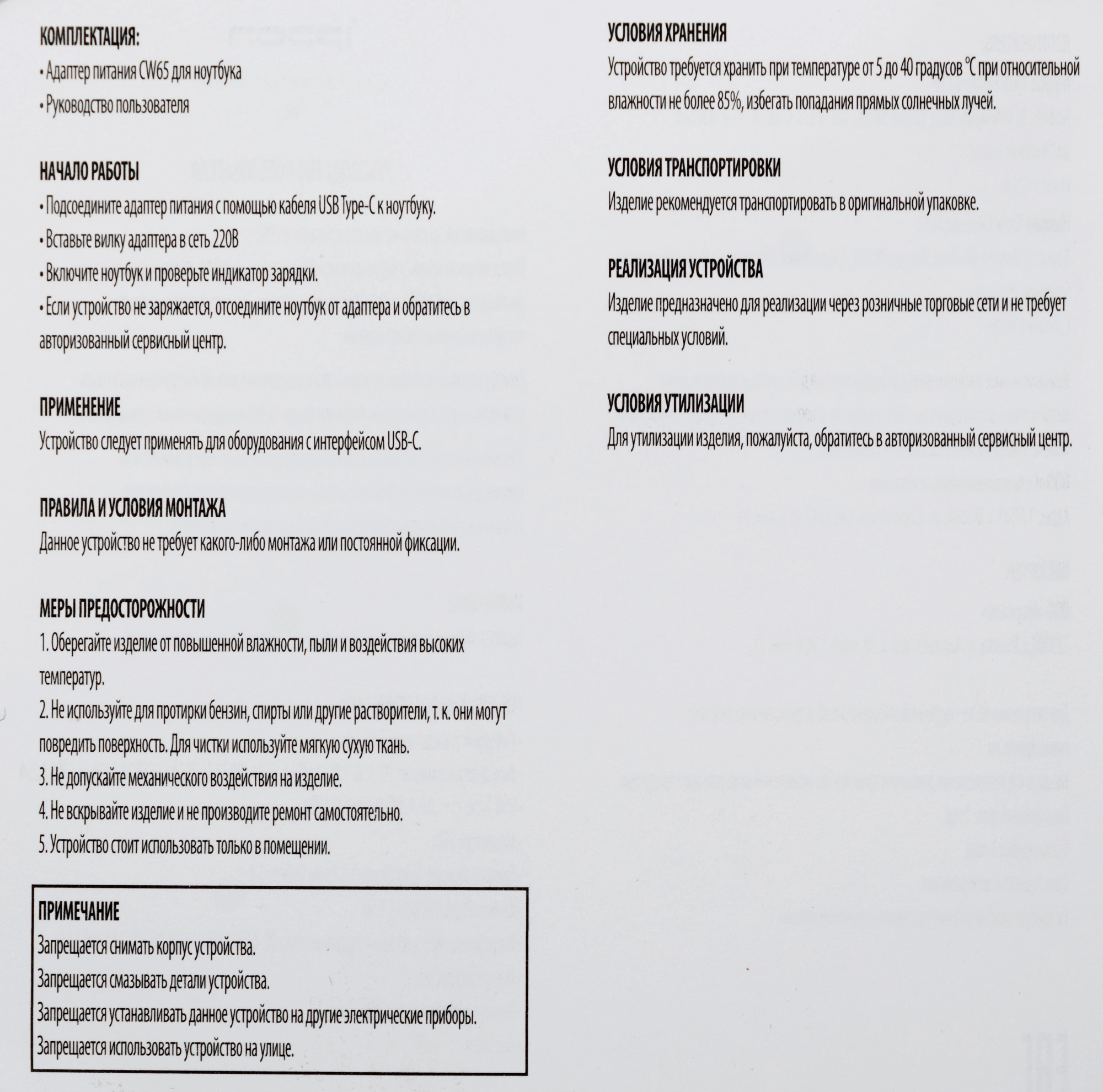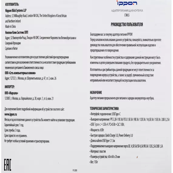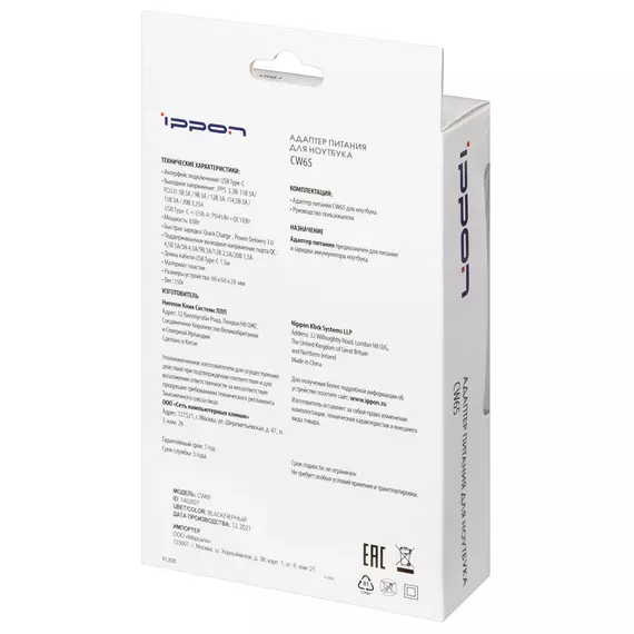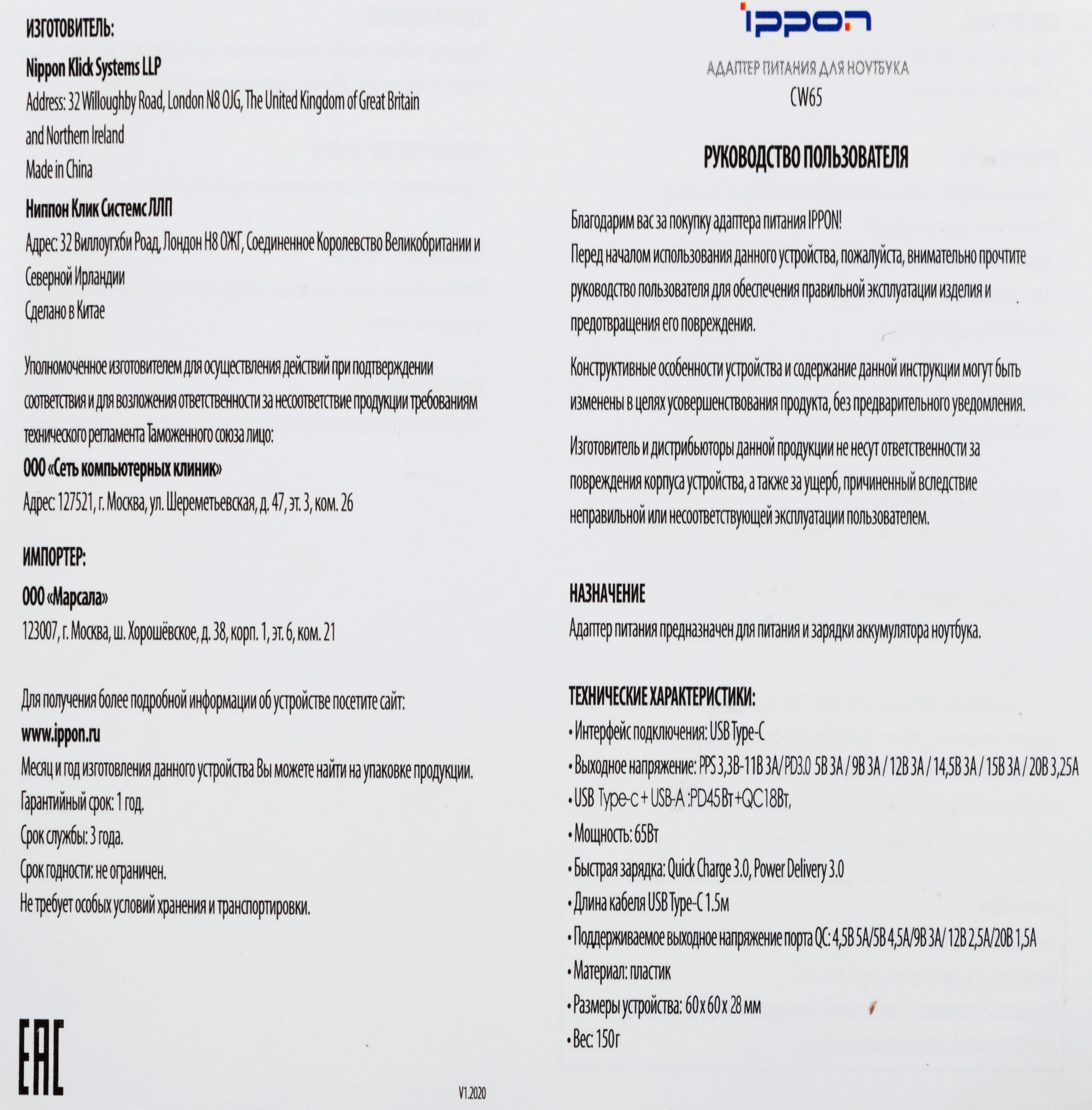 Блок питания Ippon CW65 автоматический 65W 5V-20V 3.25A 1xUSB 5A от бытовой электросети