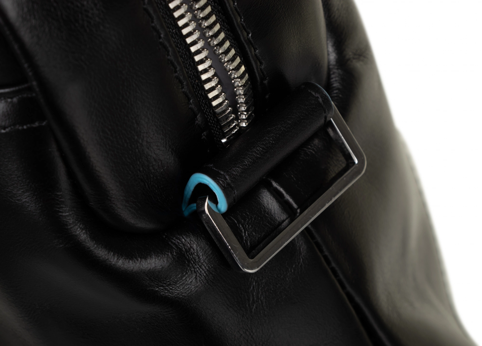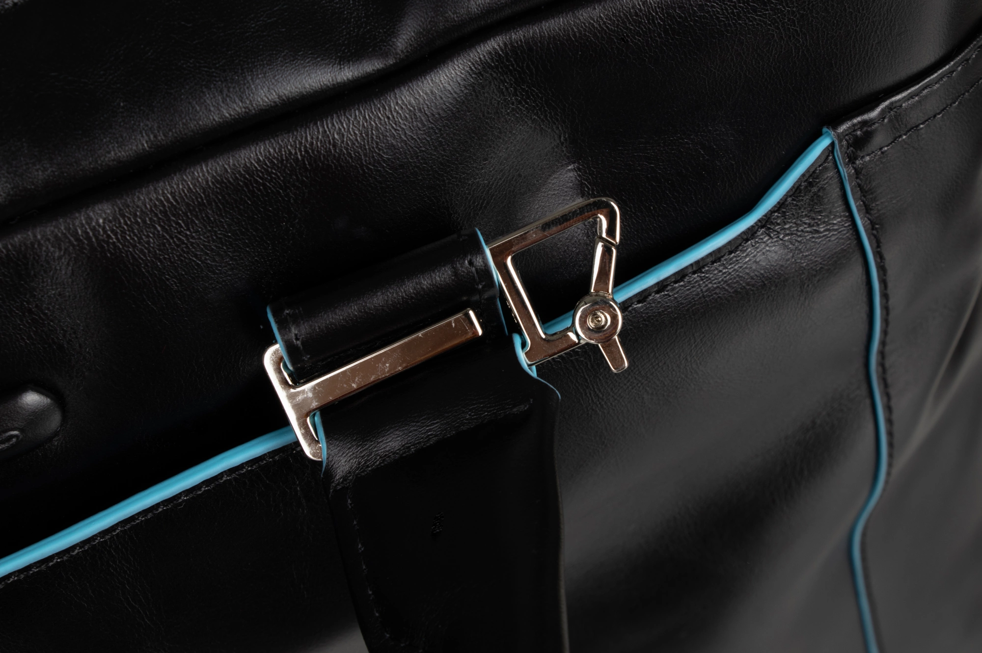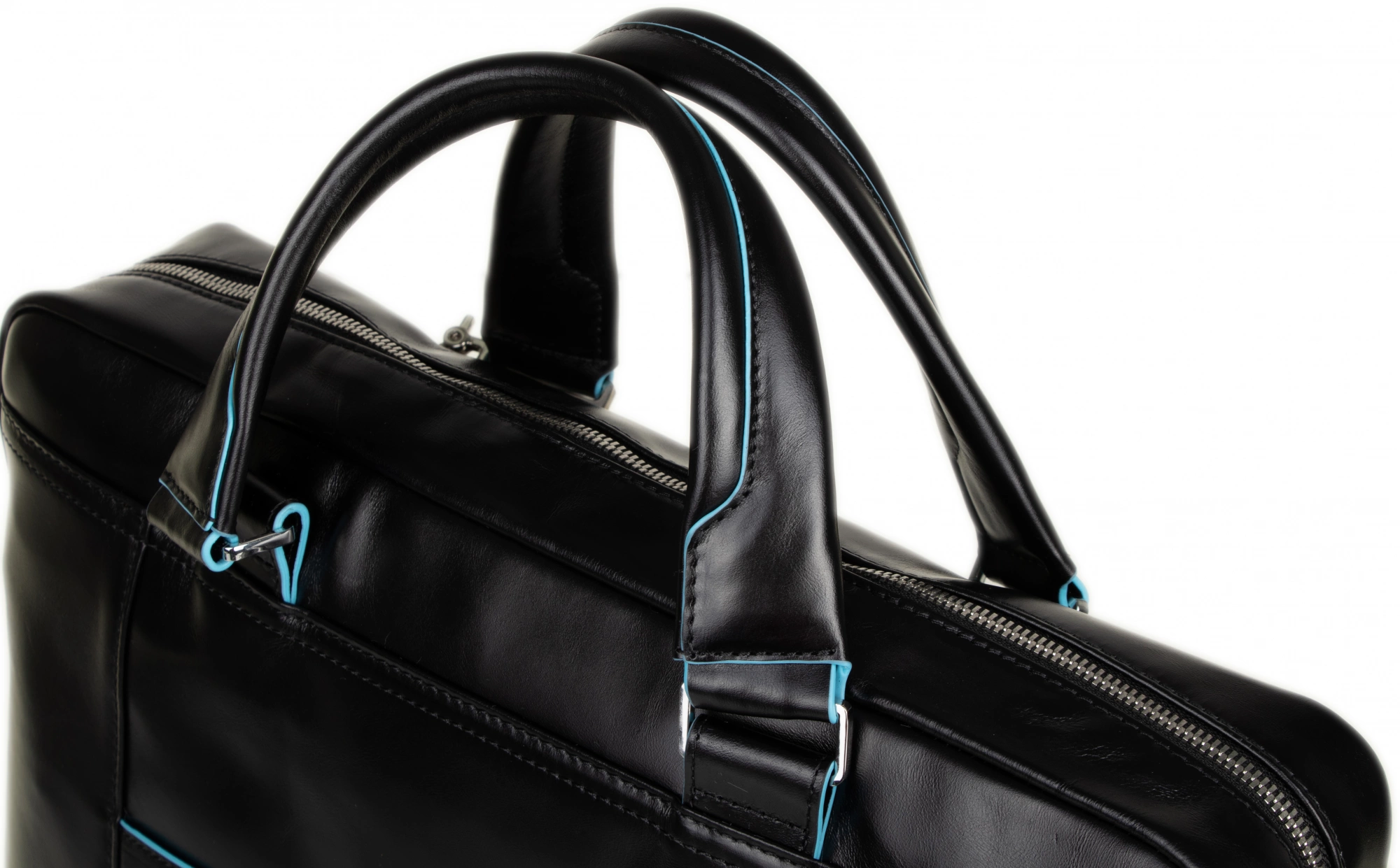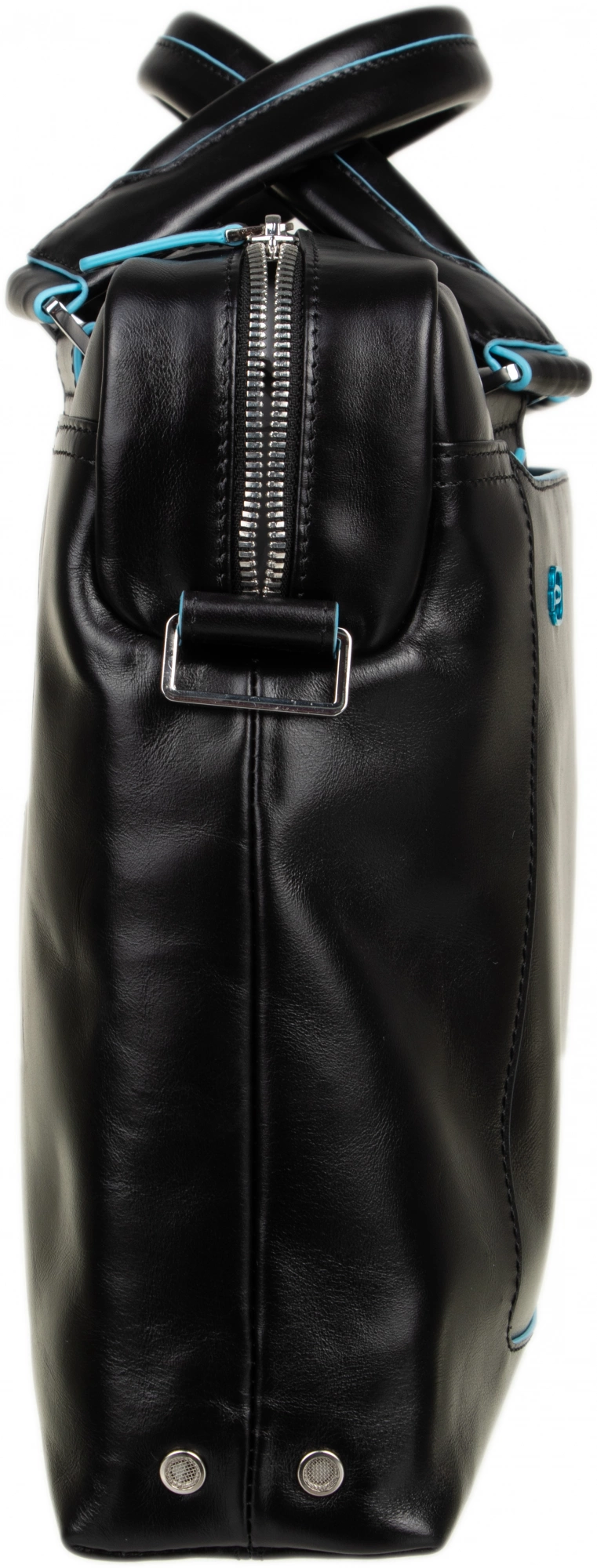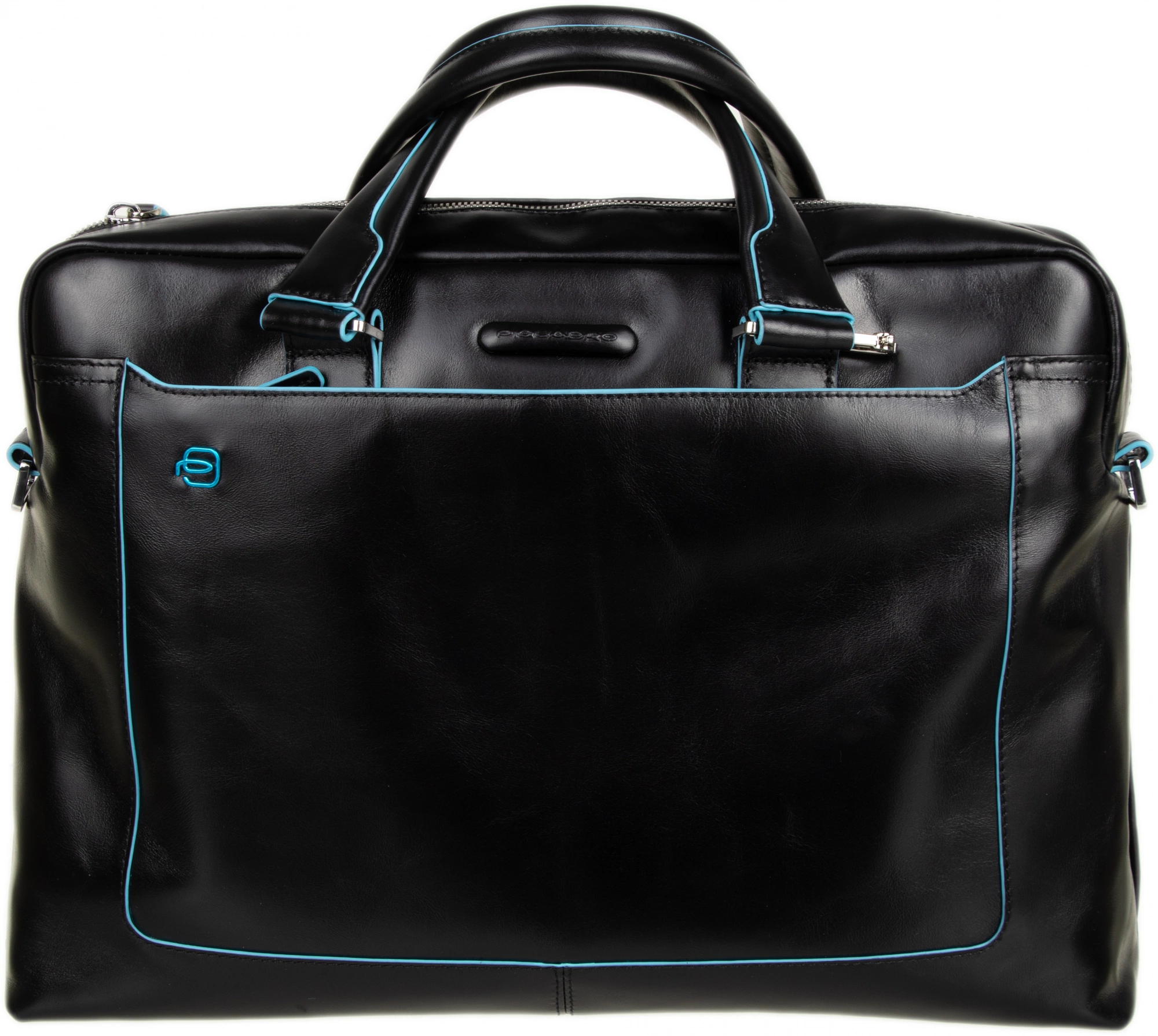 Сумка с двумя ручками из натуральной кожи с голубой окантовкой. Съемный плечевой ремень. Одно основное отделение, отделения для ноутбука (13") и iPad / iPad Air. Органайзер, карманы для мелких вещей и зонта. Система крепления к ручке багажной сумки. Внешний большой карман на молнии