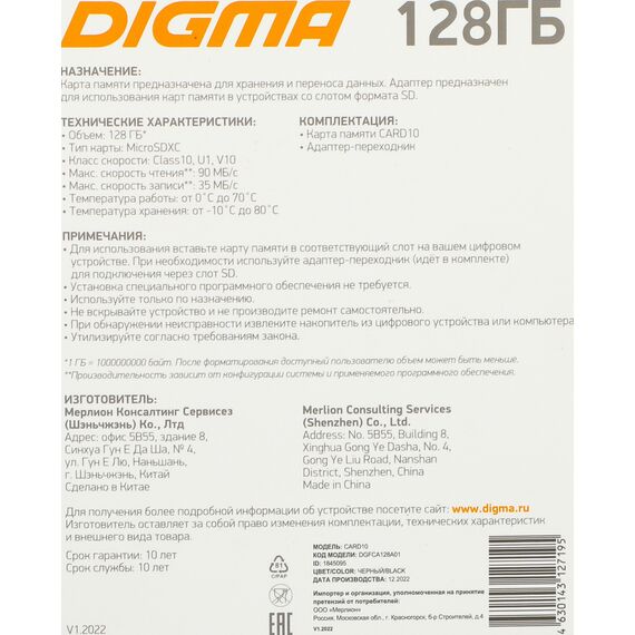 Описание Digma 128Gb CARD10 V10 [DGFCA128A01]