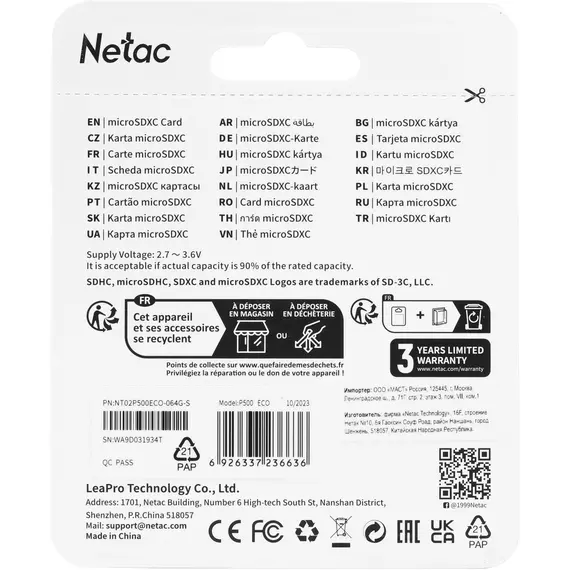 Флеш карта microSDXC Netac 64GB P500 Eco [NT02P500ECO-064G-S]